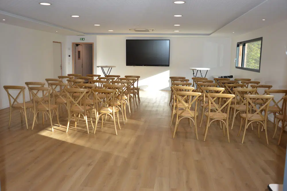 Cette salle est conçue avant tout pour les séminaires de part ses caractéristiques acoustiques et ses équipements particuliers (écran paperboard numérique tactile, lumières tamisables). Elle est proposée également comme salle d’appoint (cérémonie, apéro, jeux, enfants) en complément de « La Grange », ainsi que pour de petits événements (anniversaires, baptêmes, réunion de famille, départ en retraite, pots d’entreprise).